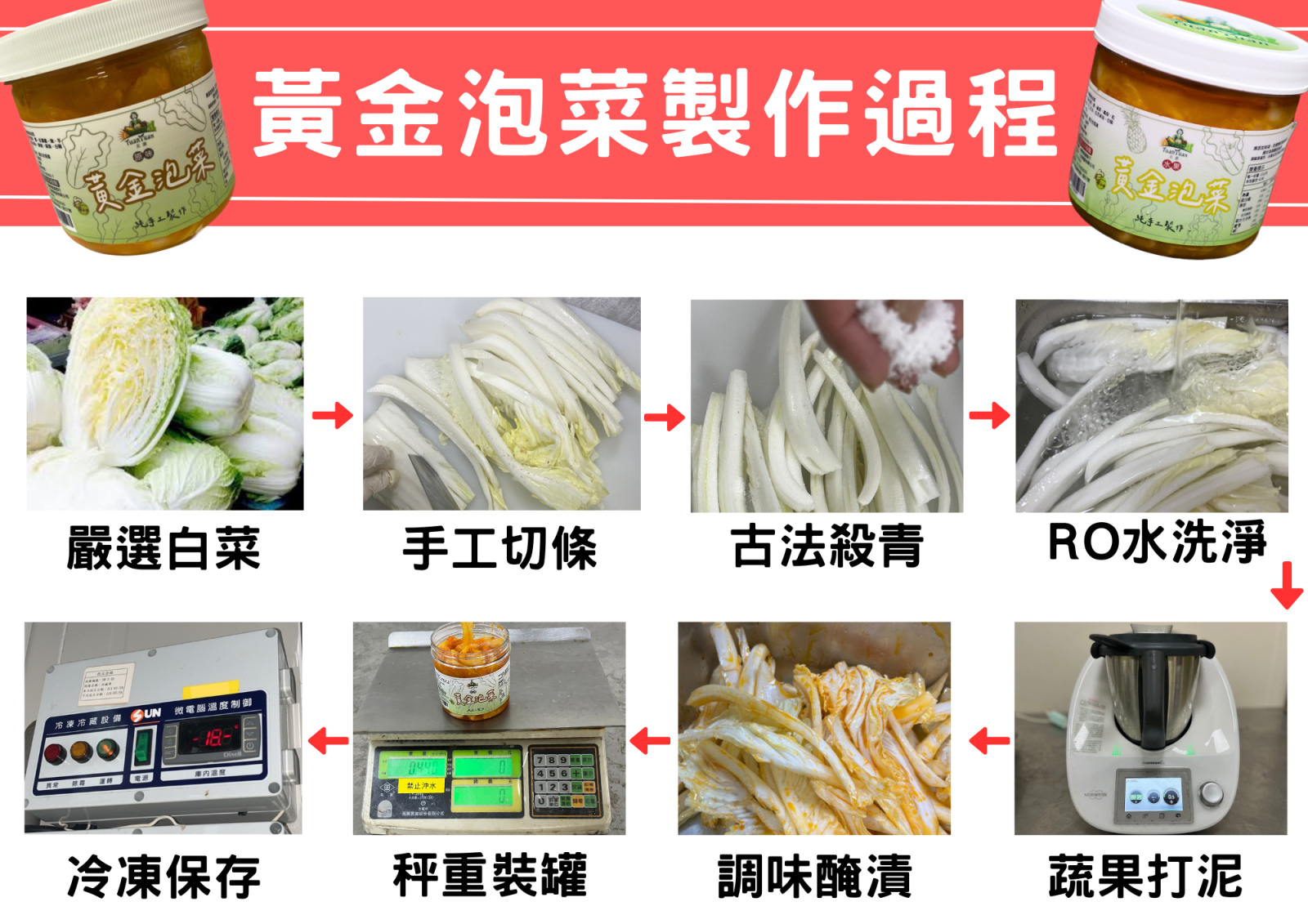 黃金泡菜以爽脆的新鮮高麗菜為主要食材,搭配特調的黃金醬汁,融合天然發酵技術,打造獨特的酸甜平衡口感。其鮮黃誘人的色澤,源自天然食材,無添加人工色素,健康又安心。